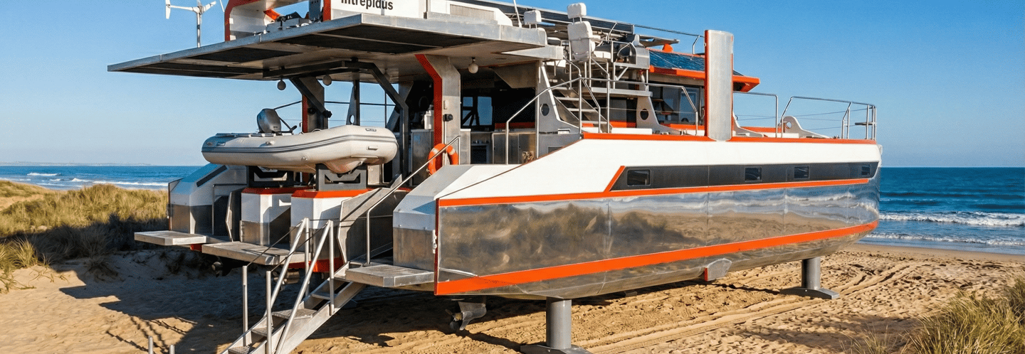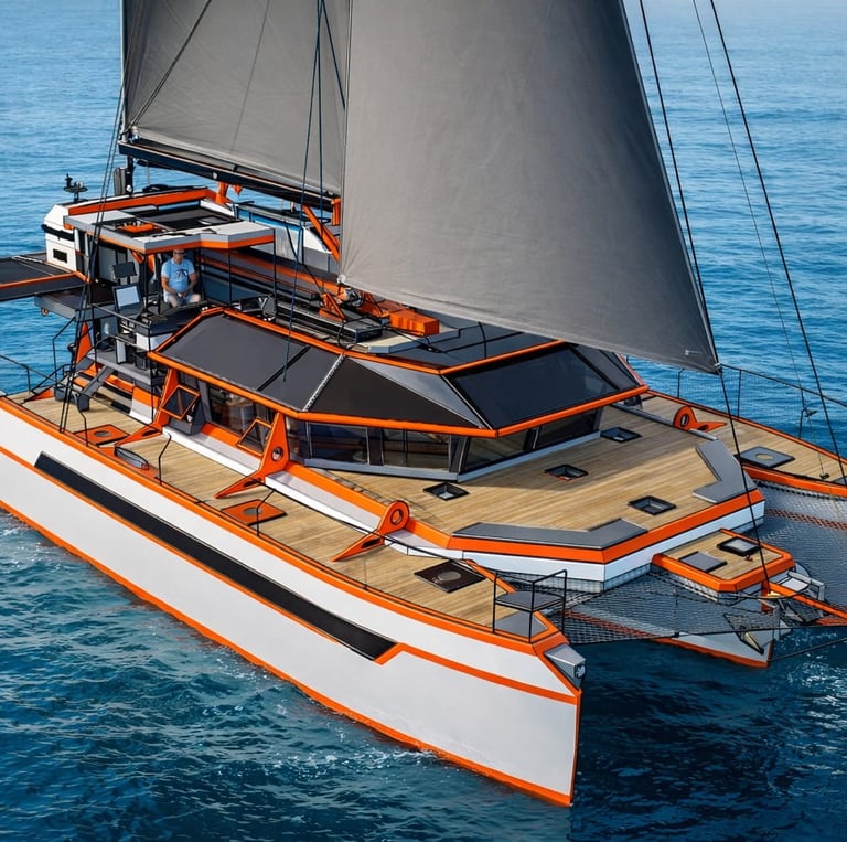 Um trimarã híbrido que é muito mais que um barco: é seu lar móvel, seguro e confortável em qualquer litoral do mundo.